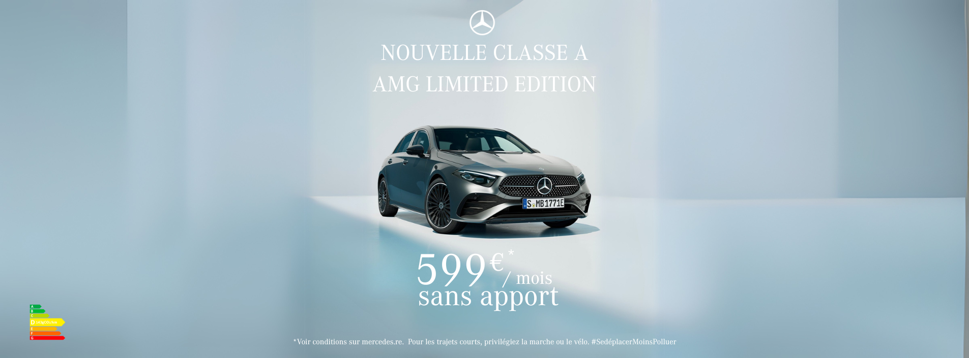 (*)Exemple pour une location longue durée d’une Classe A 180 AMG Limited Edition sur une mensualité de 60 mois et 60 000 km sans apport avant le 31 juillet 2025. Consommation en cycle mixte (l/100km) : 5.8 – 6.3 – Emissions de CO2 en cycle mixte WLTP (g/km) : 131 – 143. Offre non cumulable. Dans la limite des stocks disponibles. Réservé aux particuliers dans le réseau. Sous réserve d’étude et d’acceptation par CREDIT MODERNE OCEAN INDICNE S.